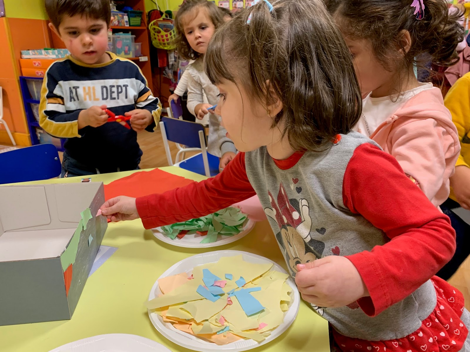 En primer lugar recortamos papeles con las tijeras para después, entre todos/as pegarlos en la cajita.